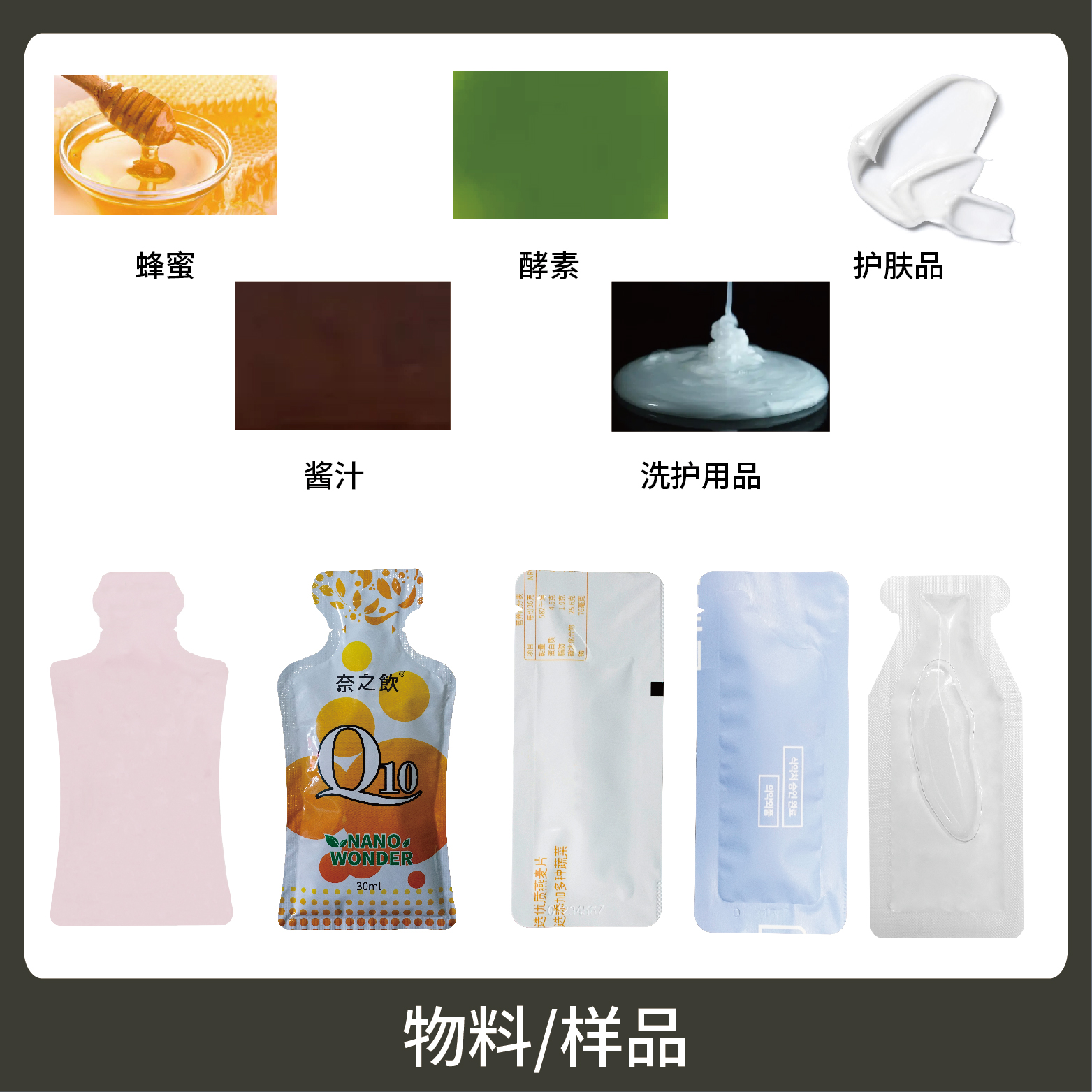 適用于各行業中酵素、果汁、漱口水、洗護用品、染發劑、化妝品小樣等醬料、液體物品的雙列異形袋計量包裝。